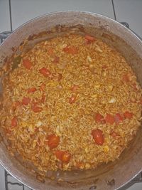 In einer sehr heissen, flachen Pfanne 50 g Olivenöl erhitzen. 280 g grob gehackte Zwiebeln darin andünsten, bis sie leicht bräunlich sind. Dann 65 g grob gehackten Knoblauch sowie 250 g grob gehackten roten Peperoni (Paprika) dazugeben und alles gut weiterdünsten.